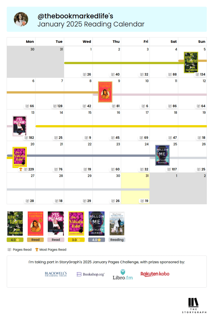 What better way to wrap up the longest month of the year than with a post about the books I read to pass the time? For those of you who are into visuals and data (like me), here’s my reading for the month, as presented via The StoryGraph’s monthly wrap-up graphics.